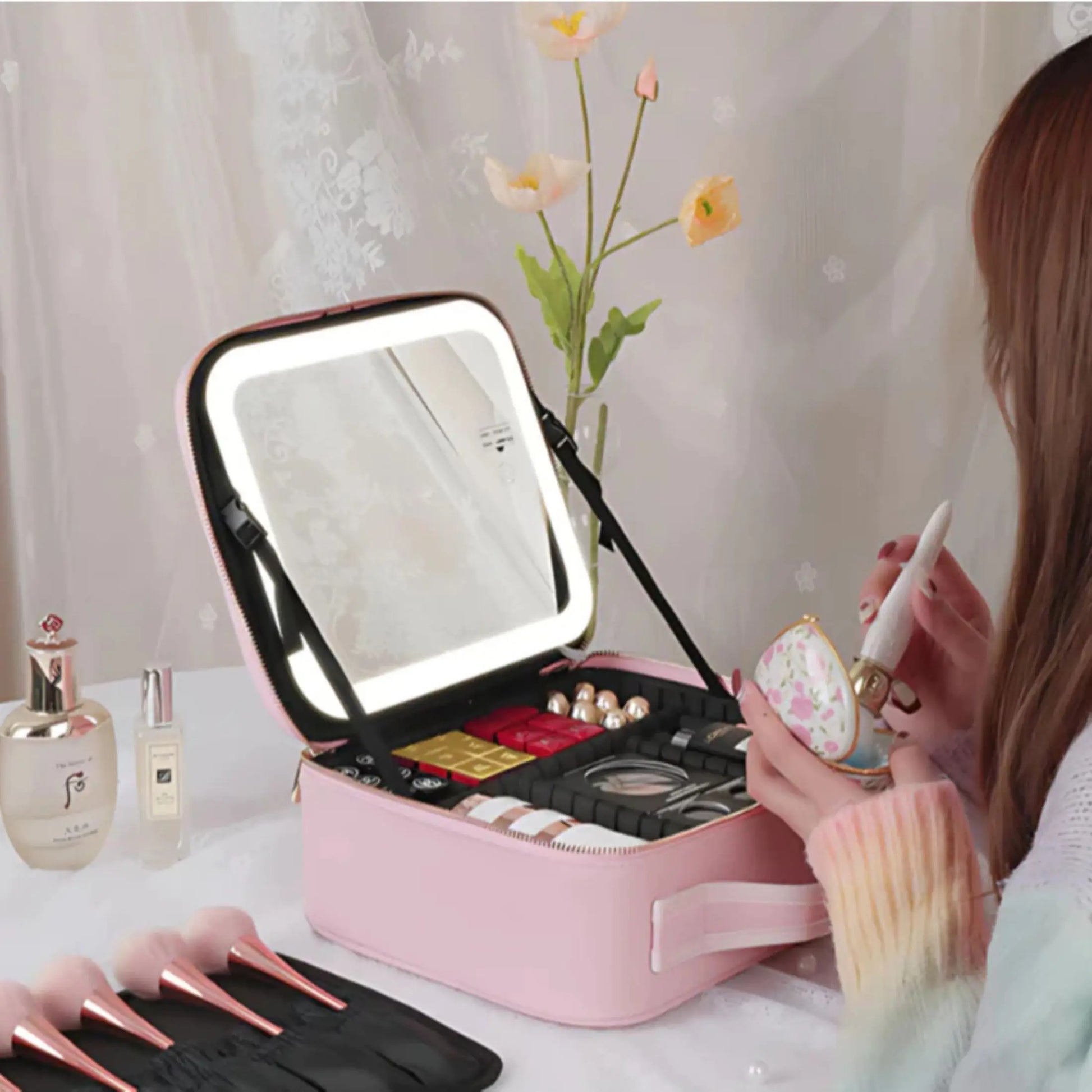 Maleta de Maquiagem Profissional com Espelho e Luz LED USB